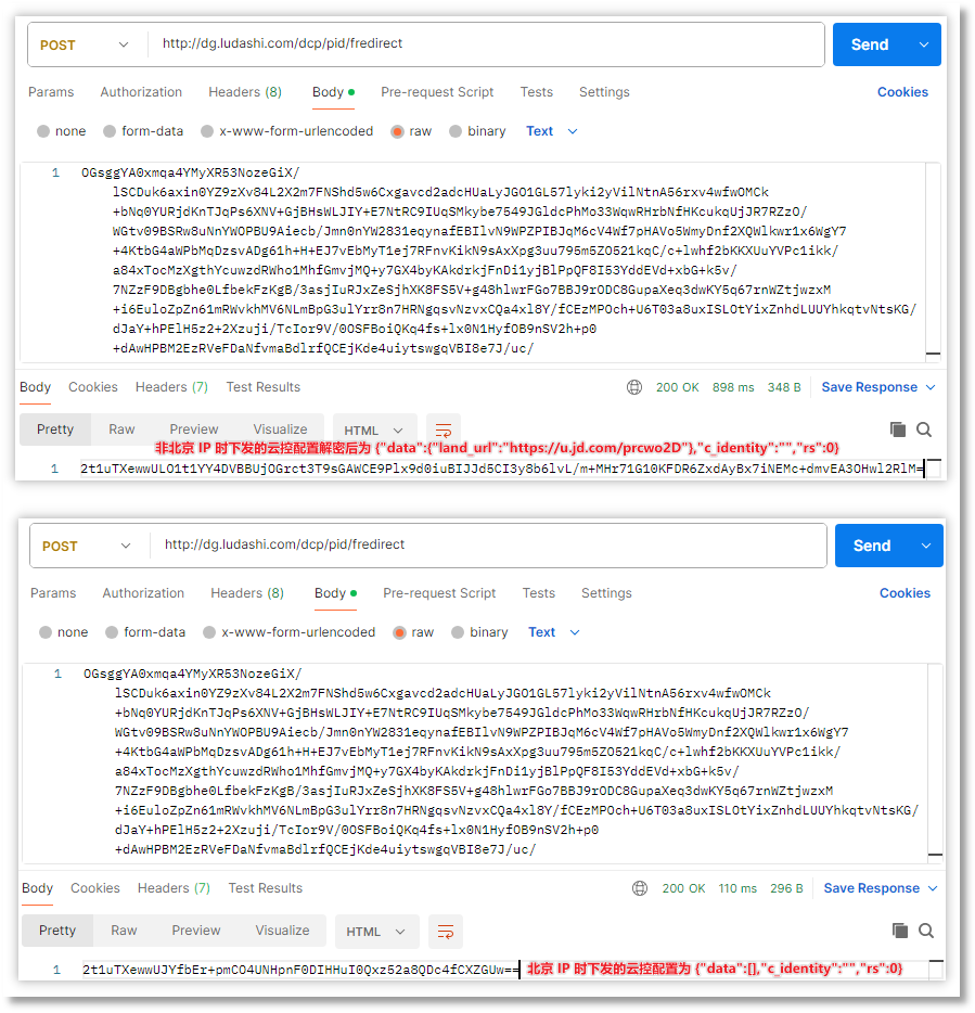 在获取京粉佣金链接时,系统同样会对北京IP进行规避。例如,北京IP获取的云控配置中 data.land_url 字段为空,而太原等其他地区的IP则会返回该字段的具体值,如下所示。