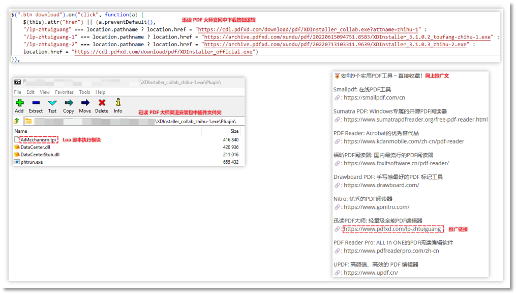例如,迅读 PDF 大师会根据访问官网时的URL参数动态切换安装包下载地址。官网渠道提供的安装包不包含推广插件,而其他渠道的安装包则内置推广插件。