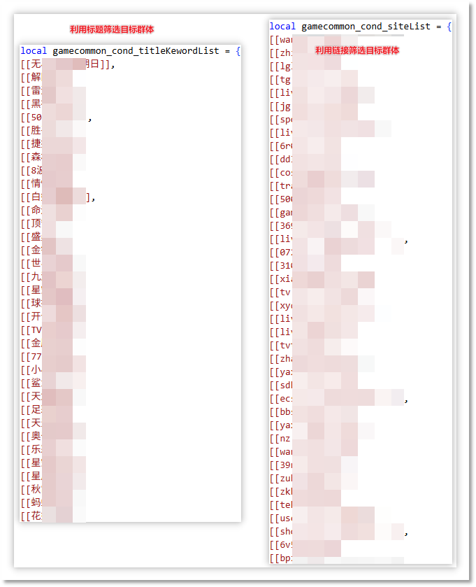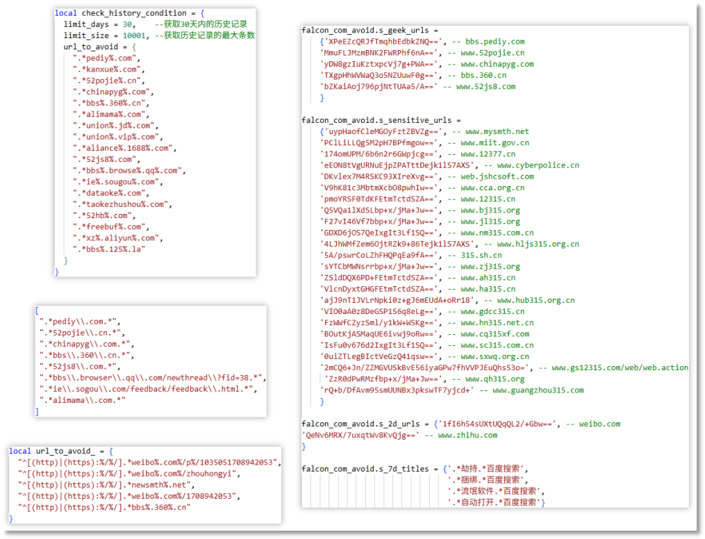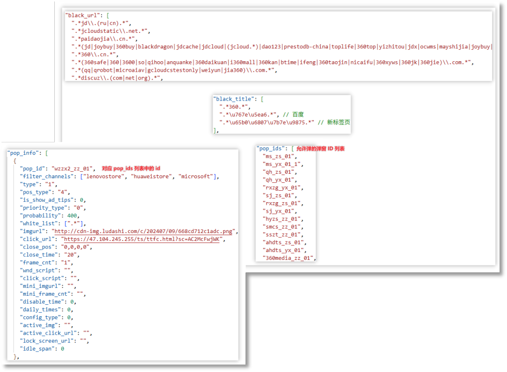 下图为云控配置中出现的 black_url 与 black_title 字段,根据其命名及所列网址和标题内容,推测是禁止弹窗的页面。且云控配置中的 pop_ids 为允许弹窗的ID列表,与 pop_info 中的 pop_id 相对应。
