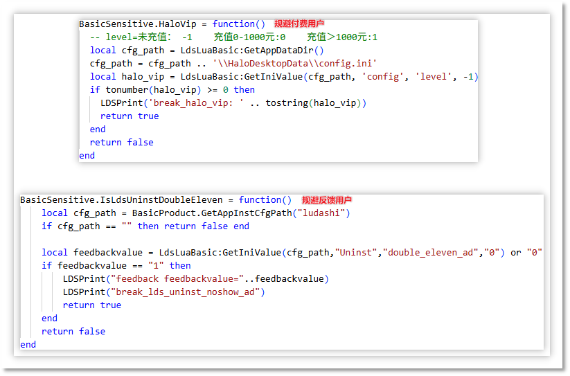 为了防止其具有争议性的推广行为被技术人员分析发现、被公众舆论讨论揭露,躲避自动化分析软件的监控和拦截,隐藏背后编织的巨型利益输送网络,这些推广模块采用了多种技术对抗手段。它们通过云控配置实时调整自身行为,专门规避技术人员等高危群体,精准针对普通用户投放。推广模块会根据用户的系统环境、地理位置、使用时长、是否充值等多维度信息判断用户价值,仅对"安全"目标、"小白"用户启动推广行为,使推广行为更加隐蔽。