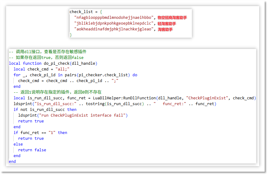 其中浏览器插件的检测是通过脚本中插件清理模块(bp_clean)中的 CheckPluginExist 函数进行检测,其中原理是遍历上述浏览器支持列表中所有 extensions 插件文件夹,检测其中是否有指定插件 ID,本次所规避的是淘客助手类浏览器插件(aokheaddinafdmjphkjlnachkejgleao)。