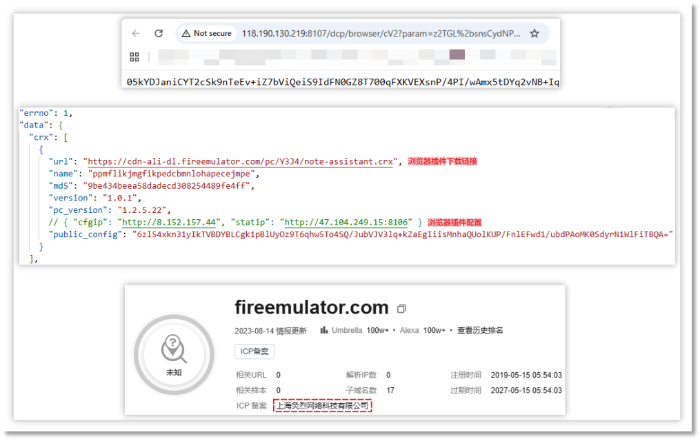 随后发送http://118.190.130.219:8107/dcp/browser/cV2?param=加密({"i":"60D2984F-487F-429d-B3F8-62E76030699E","p":"hvsLi6Wy","s":0,"t":1762314116,"v":"1.2.5.22"}) 获取插件数据,其中字段 p的值决定所获取的云控配置,当值为 hvsLi6Wy 时,返回数据中插件下载地址所属域名的备案信息为“上海灸烈网络科技有限公司”。