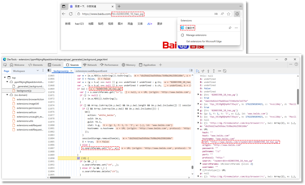 当用户使用百度搜索时,插件会自动设置tn参数。其参数值通过访问http://114.116.10.0/dcp/browser/uc?t={时间戳},随后从获取到的云控配置中的百度配置中获取渠道标识。