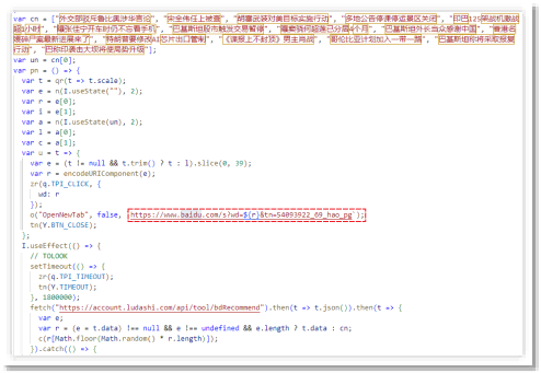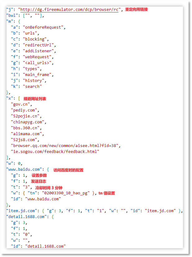根据测试中获取到的云控配置,推广模块会进行多种流量劫持操作。例如,识别到用户访问京东链接时会额外跳转至红包领取页面以获取推广佣金;识别百度搜索链接时会在URL中添加 tn 渠道标识参数以获取搜索推广分成;以及其他类似的流量劫持变现行为。