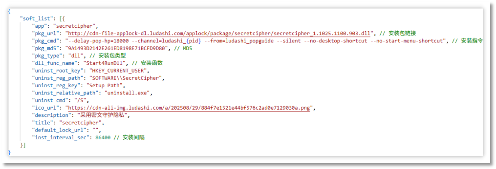 安装前先随机选择目标软件,并下载该安装包(动态链接库)并调用导出函数 Start4RunDll,以实现安装。安装时会附加静默参数 --delay-pop-hp=18000 --channel=ludashi_ludashi --from=ludashi_popguide --silent --no-desktop-shortcut --no-start-menu-shortcut,此时安装是静默的、没有托盘图标、开始菜单、桌面快捷方式等显式安装效果。