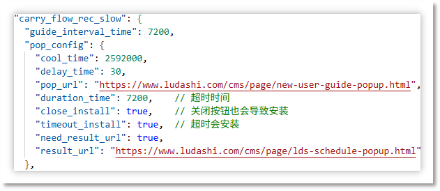云控配置:下图为整体云控配置中的弹窗安装相关配置,其中包含 close_install、timeout_install 之类的安装开关,分别为是否允许点击关闭按钮安装和超时安装。