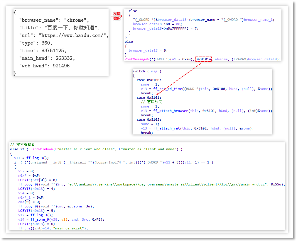 接收浏览器消息:每次切换至浏览器窗口时,BrowserBasic.tpi 会将数据传输至 master_ai_ext.tpi 模块。该数据随后被封装为 0x8001 消息发送至主窗口处理函数,随后利用 FindWindowW 寻找类名为 master_ai_client_wnd_class,窗口名为 master_ai_client_wnd_name 的窗口,以检查是否已存在对应搜索框。
